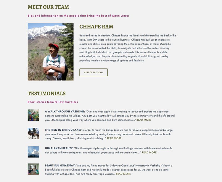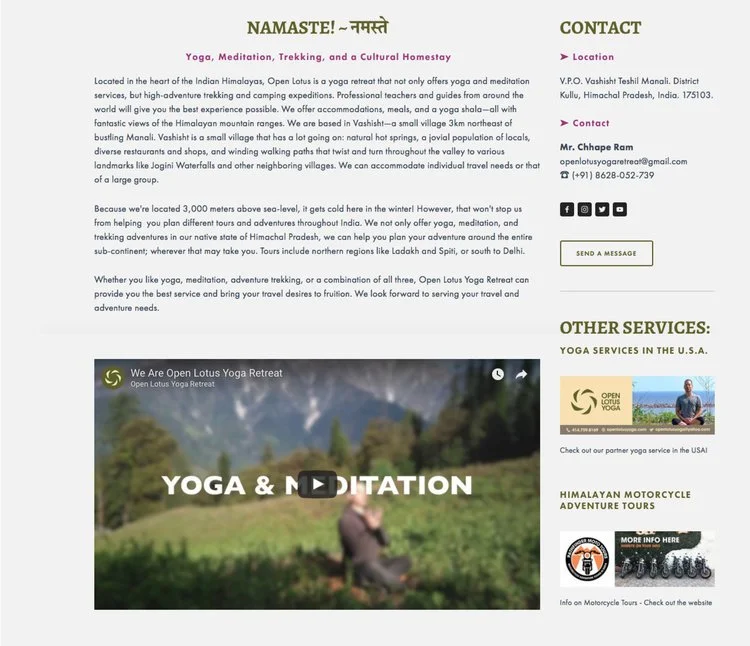 I led art direction and web design for a dual family-run business in the Indian Himalayas: Open Lotus Yoga Retreat, offering instructor-led meditation and Thai massage services, and Pathfinder Moto Tours, a motorcycle touring company guiding riders across northern India. Over the course of three months, I designed and built two websites while producing original photography—including headshots, hiking imagery, and motorcycle action shots—to help establish a cohesive visual identity for both brands. I also captured testimonials and helped build their social media presence, creating a foundation for their online marketing and storytelling.