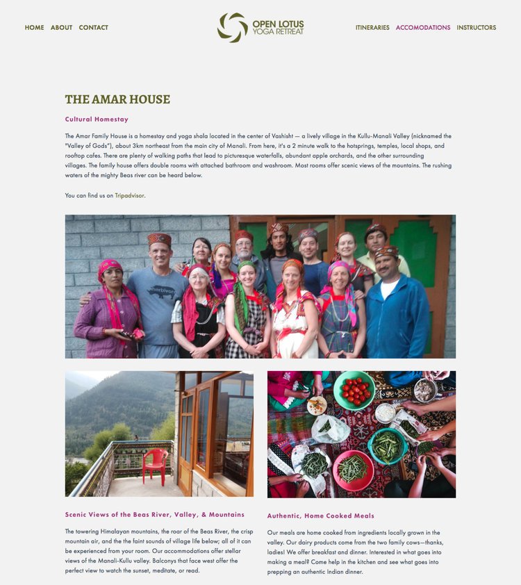 Open Lotus Yoga Retreat is a yoga/meditation/trekking service located in Manali, Himachal Pradesh, India. The Himalayan homestay is an all-inclusive yoga getaway located high in the mountains. I designed their website, handled promotional marketing, and managed social media accounts. The website contains information on tour itineraries for yoga classes and trekking/touring packages, info on the homestay, and yoga teacher credentials. Thanks to Katherine Hutchison & Meghan Moorlach of Project7 for providing photography.