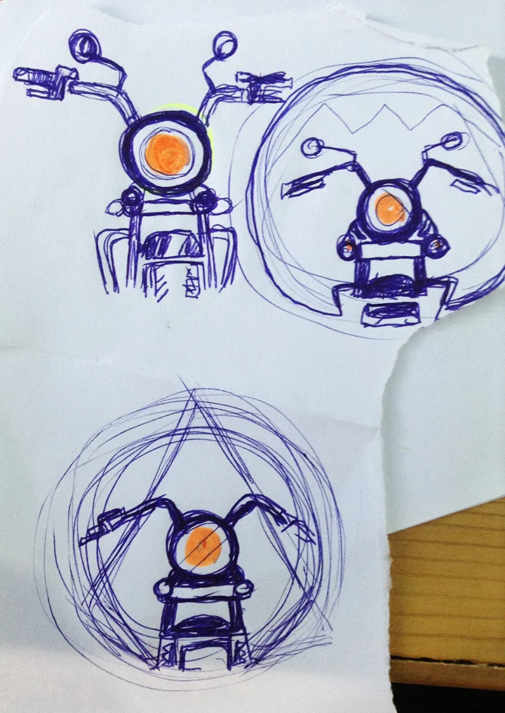 SKETCH REFINEMENT: After spitting out some bad ideas, I move on to narrow down options. I talked to Vivek and Ganesh, the proprietors of the business, to extract opinions and ideas. Sometimes this can be like pulling teeth but they seemed to know what they wanted. After going back with colors and the shape we collectively agreed a circle with a bike inside it would work well. So i took a crappy pen and drafted some options and went from there.